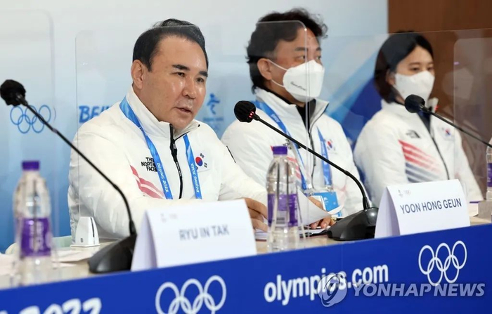 2月8日,韩国体育代表团就日前进行的男子短道速滑1000米赛事判罚结果举行紧急记者会。图源:韩联社