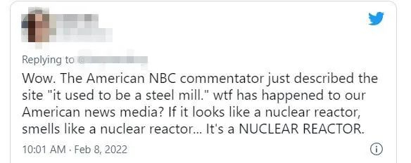 ▲在美国全国广播公司(NBC)正确解说称首钢大跳台坐落在曾经的钢厂里后,外网民众批评了NBC,认为那是一座核电站。图片来源:推特截图。