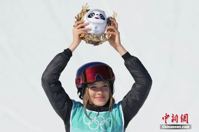 ▲2月8日,在北京首钢滑雪大跳台参赛的中国选手谷爱凌夺冠后,举起属于自己的“金墩墩”。中新社记者 毛建军 摄