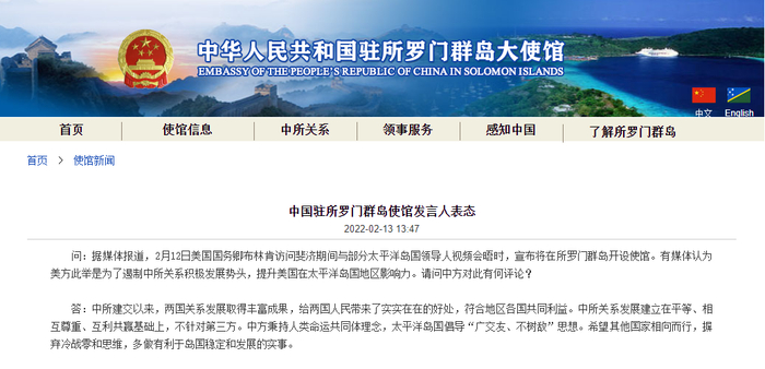 国际早报丨中方回应美将在所罗门群岛设使馆
