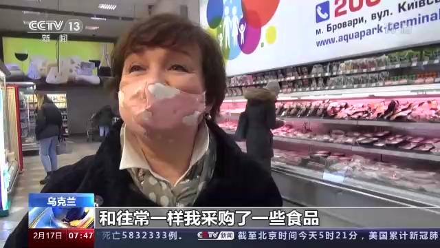 16日和往常一样,基辅市民莱西亚来到市中心的超市,为自己和家人采购了鸡蛋、面包、肉肠还有巧克力等零食。谈到目前的局势,莱西亚说她并不感到太担心,也不会去囤积食品。