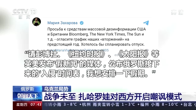 当天,俄罗斯外交部发言人扎哈罗娃先是在社交媒体上喊话西方媒体,向媒体索要一份俄罗斯“入侵”乌克兰的时间表。扎哈罗娃写道,“请彭博社、《纽约时报》、《太阳报》等英美发布‘假新闻’的媒体,公布俄罗斯接下来的‘入侵’时间表,我想安排一下假期。”