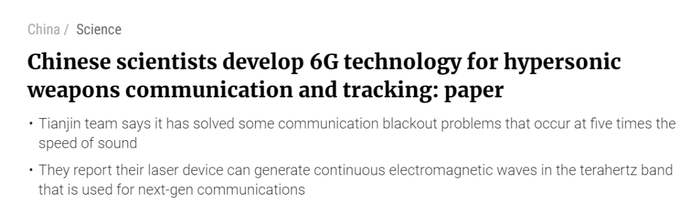 “高超音速武器可以使用6G技术进行通信和探测目标,从而消除了以5倍音速或更高速度飞行时出现的通信中断问题”。