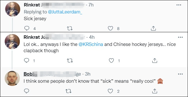 有位求生欲强的老兄担心自己用的俚语“sick”被误解(注:sick在此语境下是“cool or fabulous”的俚语说法),还特意表白了下北京昆仑鸿星冰球俱乐部和中国冰球队队服。