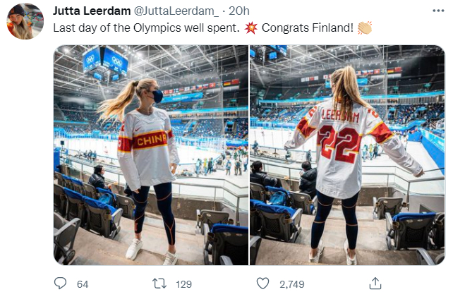 该队服正面印有“CHINA”,背面印有尤塔的姓“Leerdam”和22号数字,对于这一设计,尤塔兴奋不已。她将自己身穿中国队同款队服的照片晒到了Instagram主页、Instagram Story和推特上,一天不到,该照片在Instagram获得了15.5万个点赞。