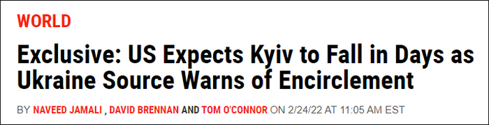 《新闻周刊》称,一位与乌克兰泽连斯基政府关系密切的消息人士也认同基辅可能会在96小时内被包围,但不认为泽连斯基的政府会垮台。当被问及乌克兰政府是否有信心打破可能的包围圈时,这位消息人士称,“我认为现在说还为时过早。。。。。。他们说乌克兰的表现好于他们的预期。”