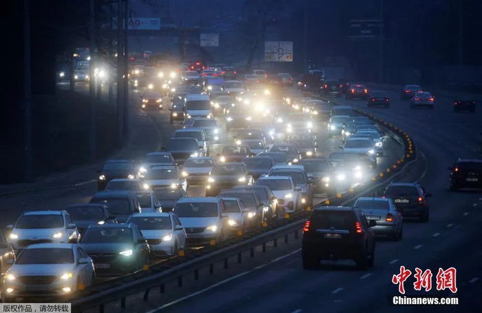 当地时间2月24日,乌克兰基辅,在俄总统普京宣布在顿巴斯地区展开军事行动后,基辅民众驾车驶向城外。