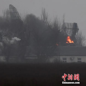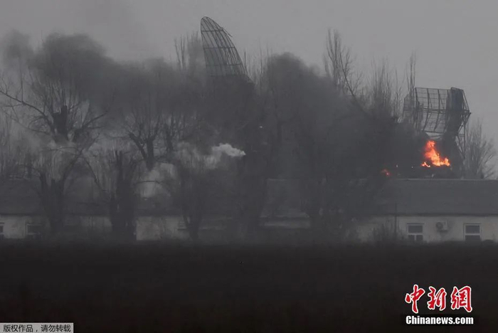当地时间2月24日,乌克兰马里乌波尔机场附近,一处军事设施起火。