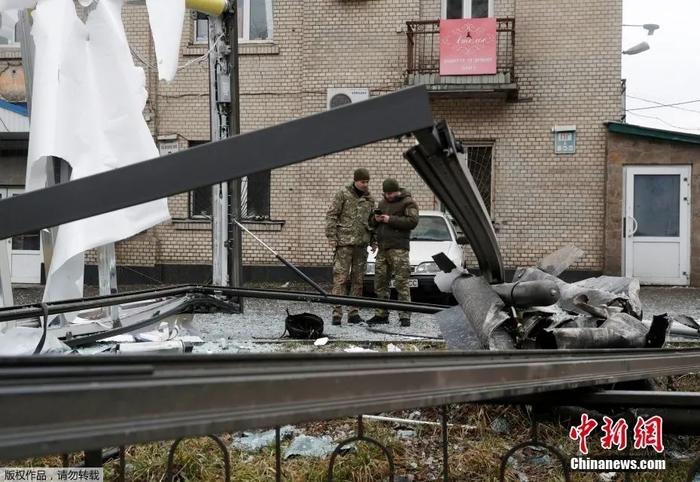 当地时间2月24日,乌克兰首都基辅,警察正在检查落在街道上的炮弹残骸。