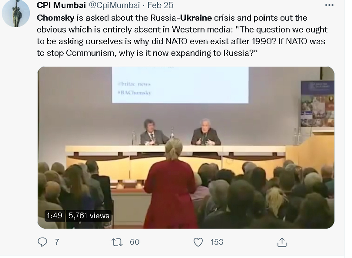 值得一提的是,自俄罗斯对乌克兰发动军事行动以来,乔姆斯基还成为了美国和西方社交网络平台上的一个颇受关注的标签人物,因为这位在西方民间有不小影响力的知识分子曾多次就乌克兰的问题发表过观点,而且大多都是质疑北约的东扩行为以及所将引发的潜在恶果的。