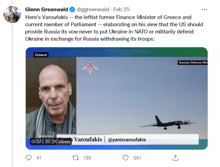 格林沃德还转引了美国地缘政治学者米尔斯海默(John J. Mearsheimer)在2015年发表的一番言论。后者当时表示西方让乌克兰走上了一条最终会招致毁灭的道路。他还称他希望西方采取的是让乌克兰“中立化”,然后在这一基础上建设乌克兰的经济,让其远离北约和俄罗斯的地缘竞争。他说,这才是乌克兰人能得到的最好的结果。