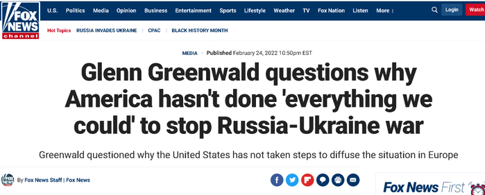 如下图所示,在俄罗斯对乌克兰动武后,福克斯新闻网专访了曾经曝光美国国安局“棱镜门”事件的记者格林沃德(Glen Greewald),后者则表示俄罗斯之所以会对乌克兰发动军事行动,是因为美国以及北约此前都没有努力去避免局势的恶化,可美国当下的舆论环境却禁止人们说出真相。