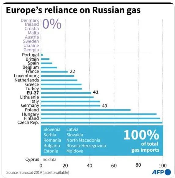 一个出路是和美欧谈判,欧洲需要的俄罗斯能源给豁免,还是能用SWIFT交易。预计这是必然会有的安排,德国的天然气49%从俄罗斯进口,波兰、匈牙利、芬兰、捷克占比更高,还有些100%依赖的国家,整个欧盟27国占41%。美国也未必乐见全球天然气供应短缺价格飙升,虽然美国天然气是资源优势,但全球通胀并非好事。