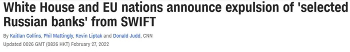2月26日晚,美国白宫发布声明,与欧洲主要盟友达成一致,将把数家俄罗斯银行从SWIFT体系中剔除。实际这是四项金融相关禁令中的一项,但作为最重大的新闻点,纷纷被各家媒体放进了标题。