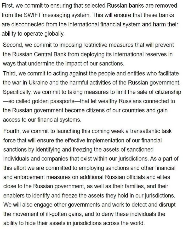 白宫26日晚的声明还是个初步的制裁框架,有许多技术细节有待参与各国商议,但是杀气腾腾的意向已经表明了,确实有实质性的变化。预计后续陆续有多轮动作,但最大的震憾性宣示已经出来了。