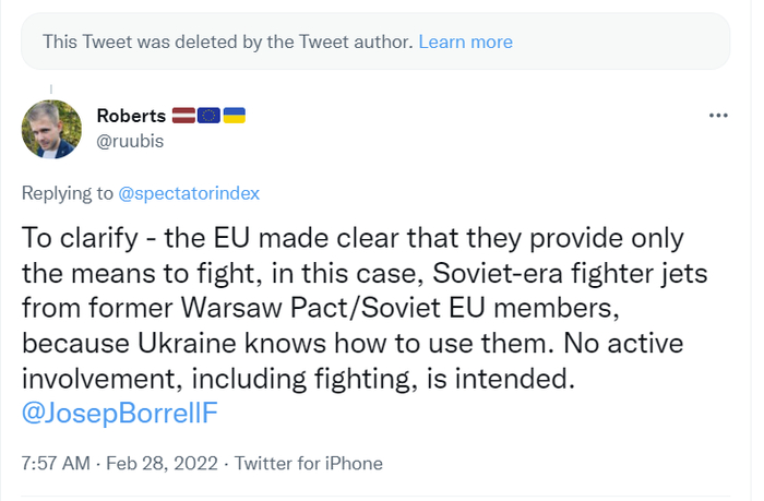 一位叫@rubbis的用户在2月28日对@spectatorindex一条已自行删除的推文回应:“澄清一下,EU已经说清楚了他们只会提供战斗武器,在本案中,(指的是)由华约欧盟成员国提供的来自苏联时代的战机,因为乌克兰知道怎么使用他们。”