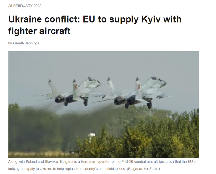据英国“简氏防务”网站在2月28日发布的报告,欧盟已经决定向乌克兰供应战斗机。具体数量上,波兰空军将为乌克兰援助21架单座和6架双座米格-29S战机,保加利亚空军将提供11架单座和3架双座米格29S;斯洛伐克会提供9座单座和两座双座米格29(尽管其中只有一小部分被认为还具有飞行条件);保加利亚空军将提供6架单座和2架双座苏-25S战机。