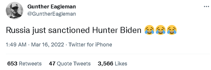 尽管俄罗斯目前还没有正式宣布制裁亨特的原因到底是什么,但他们对亨特的制裁确实引爆了美国的网络空间。
