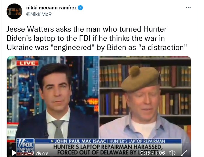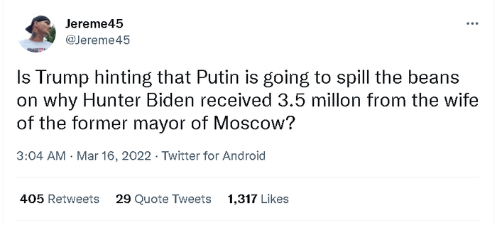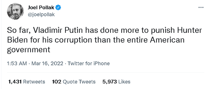 而在俄罗斯与乌克兰的冲突爆发后,拜登政府对于乌克兰泽连斯基政府的支持,也令亨特与乌克兰的关系,再次成为被共和党支持者用来向拜登和民主党发难的靶子——甚至有共和党支持者还抛出了一个“俄罗斯对乌克兰发动战争是拜登在背后推动,目的是为了转移舆论对他儿子亨特事件的关注”这样的玄幻故事。