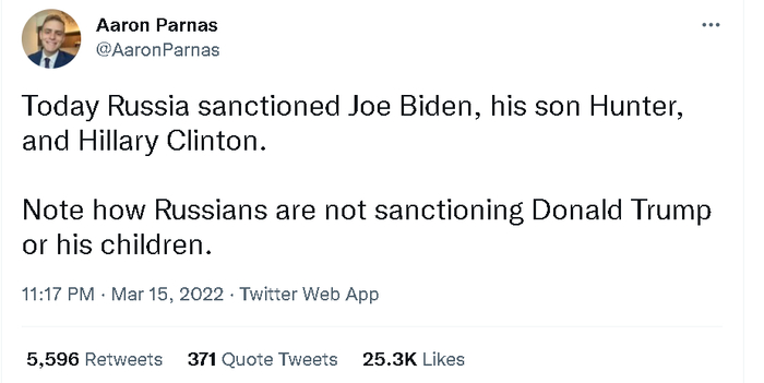 当然,拜登和民主党的支持者也不甘示弱,反怼说:怎么俄罗斯的制裁名单上没有特朗普的家人或是其他共和党的政客和支持者呢?这是不是说明特朗普和共和党是“通俄”呀?