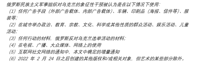 上:第二章第五节规定在乌克兰违规使用相关象征性符号的具体情境原文;下:对原文的中文翻译。