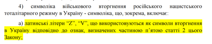 接下来在第二章,该法案在第四节第一条明确了字母“Z”和“V”的禁用条件,包括“单独使用拉丁字母‘Z’‘V’(没有合理的上下文,或在为侵略乌克兰或任何其他军事力量辩护的情况下)”,以及单独使用这些字母的西里尔字母"3""C""B""Φ"等。