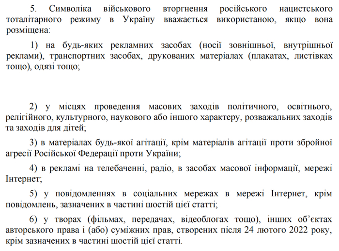 而7214号法案的第二章第五节则规定了在乌克兰违规使用相关象征性符号的具体情境。法案第三章规定,“违反本法要求的人根据乌克兰法律承担民法、行政、行政和经济及刑事责任。”