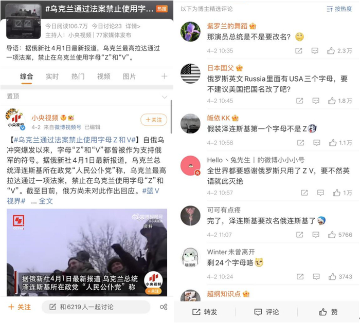 近日,简体中文网络流传一条“乌克兰通过法案禁止使用字母Z和V”的消息,中文媒体援引俄新社的报道称,拉丁字母“Z”和“V”因被看作支持俄军的符号而在乌克兰遭到禁用。消息一出即遭网友调侃:26个字母从此在乌克兰少了两个?乌克兰总统岂不是要改名了?