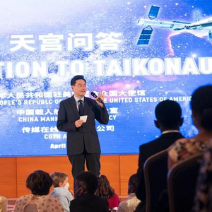 中国驻美国大使馆9日举办“天宫问答——神舟十三号航天员乘组与美国青少年问答”活动,近500名美国中小学生、老师和家长以线上线下方式与翟志刚、王亚平、叶光富三位航天员展开交流。