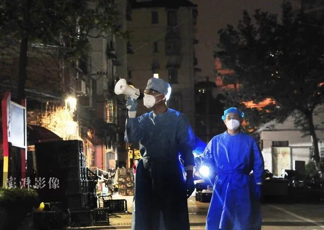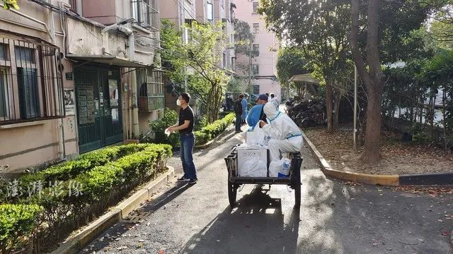 2022年4月7日,在上海杨浦区五角场街道某封控小区,物业人员投身社区各项防疫工作。图源:澎湃影像