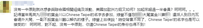 不过,针对台媒又炒作台湾参与WHA的话题,有岛内网友直言,“没有一中原则,就休想参与联合国相关组织及活动”。