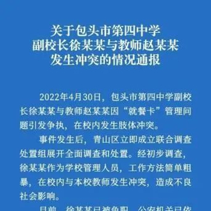 通报称:4月30日,包头市第四中学副校长徐某某与教师赵某某因“就餐卡”管理问题引发争执,在校内发生肢体冲突。