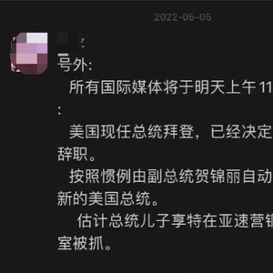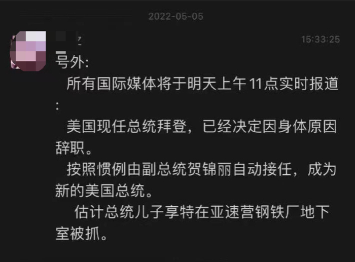 5月5日下午,部分网络平台传播一则消息,拜登因身体原因决定辞职、卡玛拉·哈里斯接任,并推测亨特·拜登在亚速钢铁厂地下室被擒获。