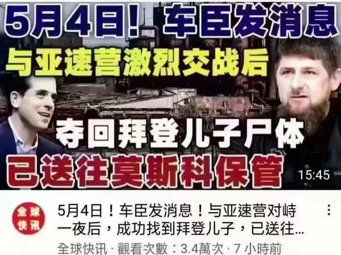 另有自媒体表示,车臣“与亚速营激烈交战后,夺回拜登儿子尸体”,已送往莫斯科。
