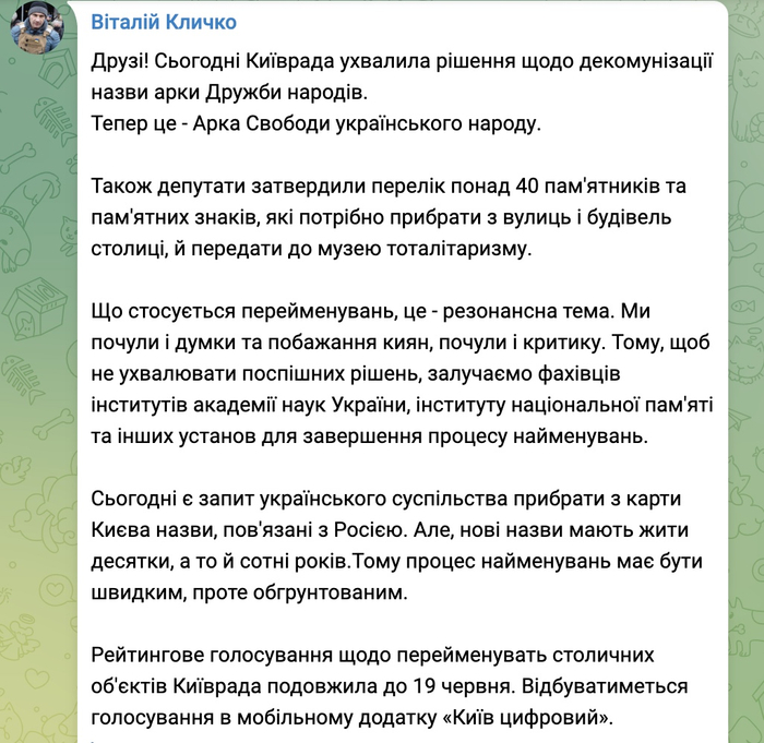 当地时间5月14日,克利奇科宣布,“人民友谊拱门”将更名为“乌克兰人民自由拱门”,此外,议员们批准了一份40多个(与俄罗斯有关的)纪念碑和纪念标志的名单,需要把这些纪念碑和纪念标志从基辅的街道和建筑物中移走并转交到“极权主义博物馆”。该“博物馆”由利沃夫市议会发起筹建,于2014年至2016年间建设,其官方介绍称,“博物馆”主要探索、呈现20世纪中期的悲剧。