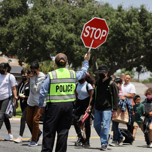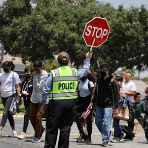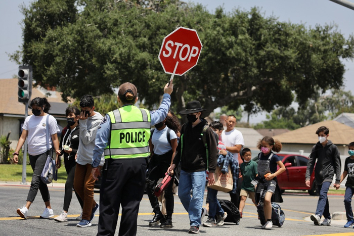 5月25日,一名警员在美国洛杉矶县一所小学附近临时指挥交通,为学生放学提供安全保护。新华社发