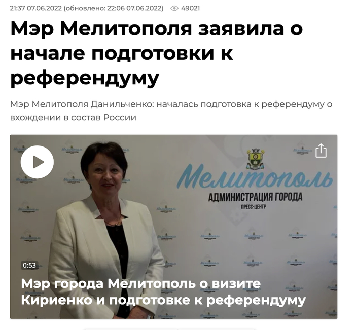 除罗戈夫外,扎波罗热州梅里托波尔市“市长”加琳娜·丹尼尔琴科(Galina Danilchenko)也于6月7日宣布开始准备入俄公投。丹尼尔琴科于2015年作为反对党代表加入梅里托波尔市议会,并被任命为议会秘书。2022年3月11日,梅里托波尔市长伊万·费多罗夫(Ivan Fedorov)被俄罗斯军方拘留,丹尼尔琴科随之被任命为“梅里托波尔代理市长”。