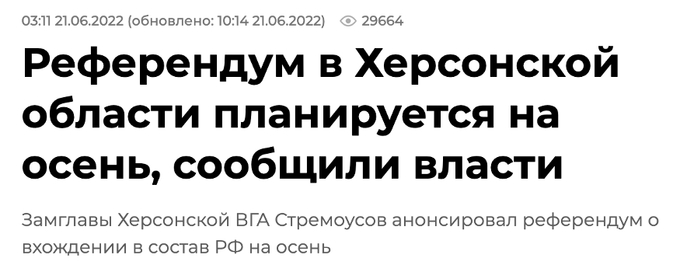 俄新社6月21日援引斯特雷穆索夫报道赫尔松公投。