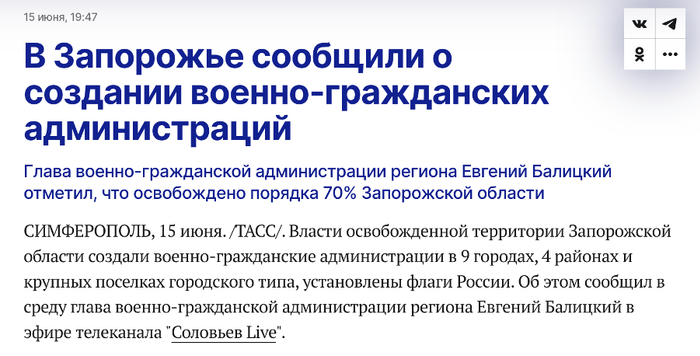 这位被引用的信源全名弗拉基米尔·罗戈夫(Volodymir Rogov),据称为扎波罗热州军民政府(VGA)代表。不过,值得注意的是,“扎波罗热州军民政府”仅仅在处于俄军掌控之下的几个城市和居民点运行。据塔斯社报道,扎波罗热地区军民政府负责人叶夫根尼·巴利茨基(Yevgeny Balitsky)于当地时间6月15日在电视直播上宣布正式成立该地区军民政府。截至发稿时,扎波罗热州约70%的土地处于俄军的掌控之下,但是乌方仍控制着占该地区人口约50%的扎波罗热市。