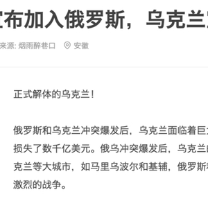 近日,社交平台上流传一则消息称,乌克兰4个州宣布加入俄罗斯,乌宣布将正式解体。据称,“在卢甘斯克、顿涅茨克和赫尔松州申请加入俄罗斯并获得批准后”,扎波罗热州也正式宣布加入俄罗斯联邦。