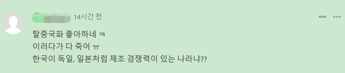 另一位网民在“news1”报道下说:“(韩国政府)那么喜欢‘脱中国’啊。(呵呵)这样下去我们都要完蛋了。(哭)难道以为韩国是像德国和日本那样具有制造业竞争力的国家吗?”↓