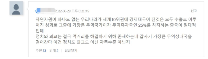 一名网民在JTBC电视台相关报道下写道:“韩国作为一个自然资源稀缺的国家,之所以能够在世界十大经济强国中占有一席之地,全是靠出口实现的。而在出口贸易中,韩国最大的贸易国是中国,并且对华保有贸易顺差,(对于韩国来说)中国(的地位)是绝对(重要)的。政治和外交终究是为了解决生存和温饱问题而存在的,突然踢了最大的贸易伙伴国一脚,(我认为) 这不是政治,也不是外交,而是自毁灭亡吧。”↓