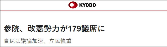 但此次选举带来的最大变化在于,日本支持修宪的势力取得了“重大胜利”。除自民党和公明党外,同样支持修宪的日本维新会赢得12席,国民民主党则赢得5席。共同社称,还有两名支持修宪的无党派人士当选参议员,因此修宪势力获得的改选席位总数达到95席。