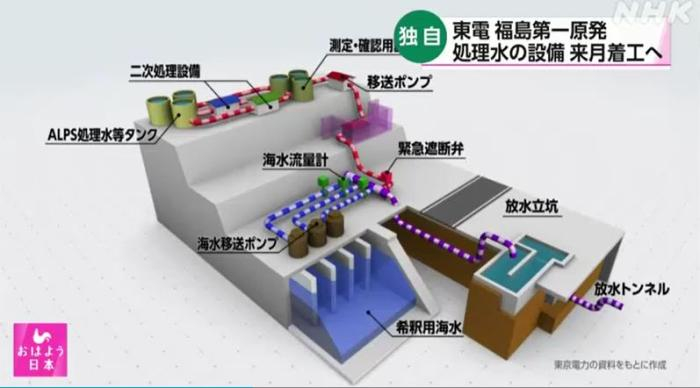 根据计划,核污水将用海水稀释,在竖井临时储存并确认浓度后,再通过海底隧道在近海约1公里处排放。
