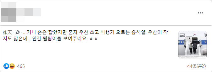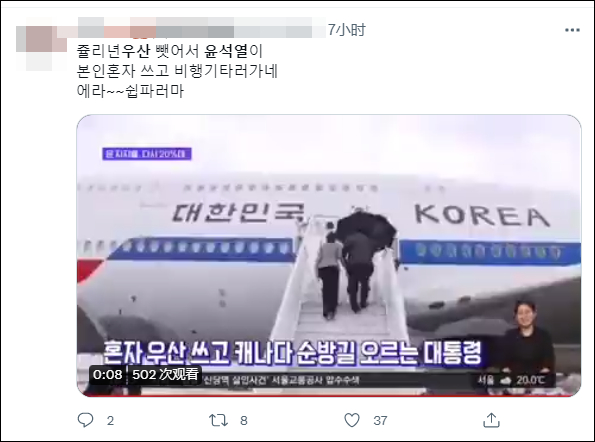 当时天降小雨,尹锡悦一人撑伞登机,似乎忘记了他另一手牵着的第一夫人金建希还在淋雨……