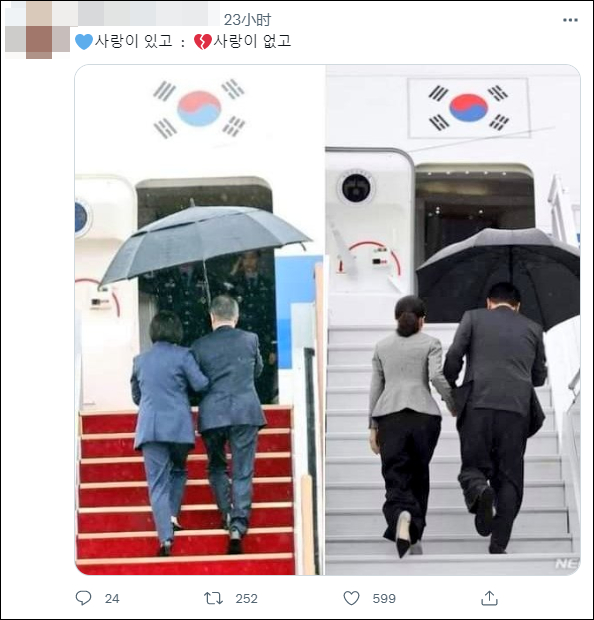 有人放出了韩国前任总统文在寅的“携妻打伞照”进行对比:“有爱VS没有爱”。