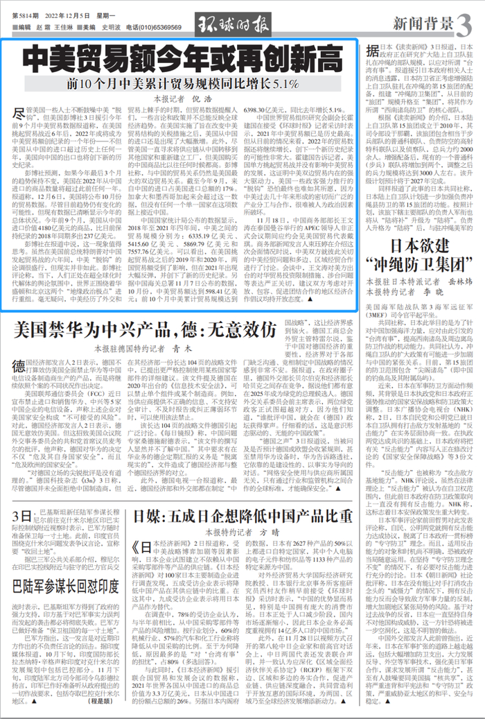 尽管美国一些人士不断鼓噪中美“脱钩”,但美国彭博社3日援引今年前9个月中美贸易数据报道称,在美国挑起贸易战近6年后,2022年或将成为中美贸易额创纪录的一个年份——不但美国从中国的进口超过历史上任何一年,美国向中国的出口也将创下新的历史纪录。