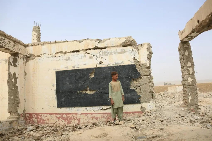 ▲2021年8月23日,在阿富汗南部赫尔曼德省桑金地区,一名男孩站在废墟之中。桑金地区曾经最繁华的市场,如今遍布美军空袭留下的一个个巨大弹坑。新华社发(塞夫拉赫曼·萨菲 摄)