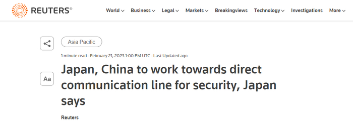 [文/观察者网 王世纯]综合路透社、日本NHK网站2月22日报道,日本防卫省21日在一份声明中表示,在22日举行的第十七次中日安全对话上,日本将致力于与中方建立直接的安全沟通渠道。