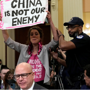我们需要众议院的这些听证会是关于和平与正义的,而不是仇恨与战争。这就是为什么我的朋友、“粉色代码”的奥利维亚去打断听证会。这是她第三次在美国政客谈论中国的场合进行抗议。